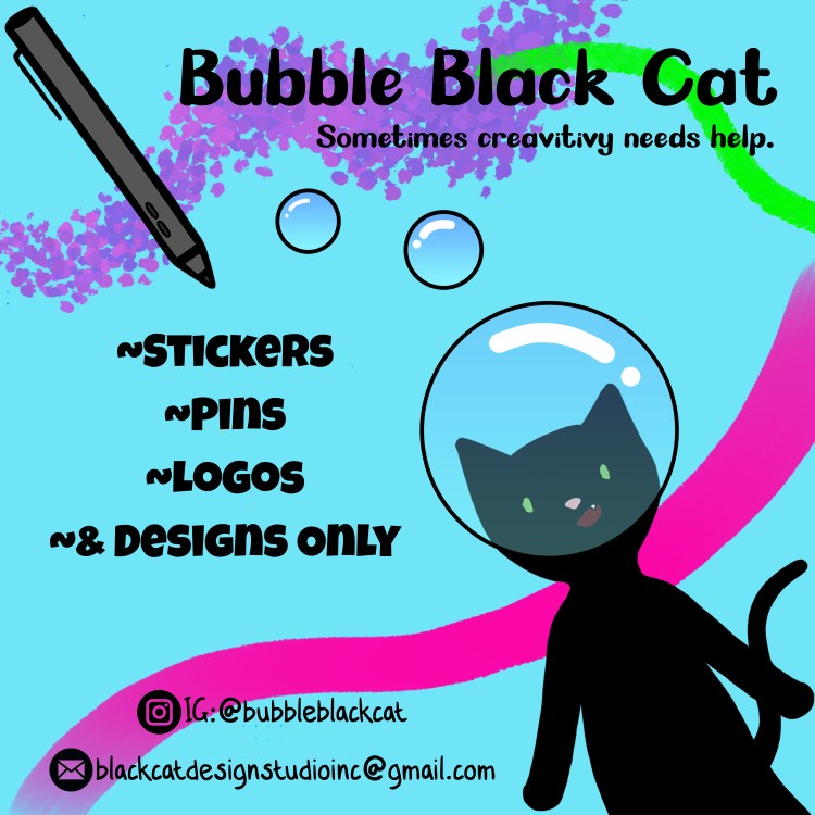 Follow me on instragram to see more of my art. Find me as @bubbleblackcat. You can also contact me via email throught blackcatdesignstudioinc@gmail.com.